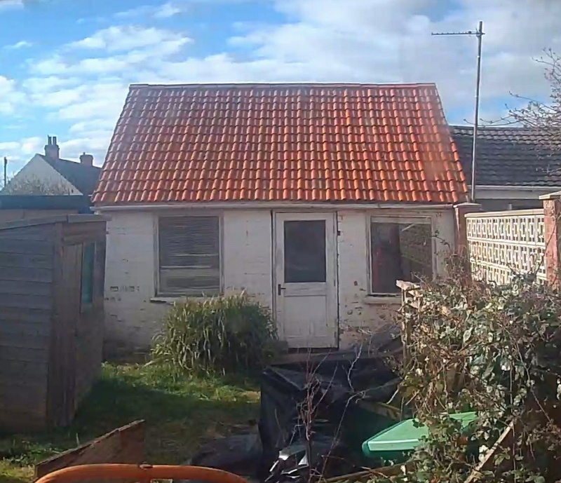 After being let down by my first builder, I eventually got a start date in April 2023 and I set about completing the clearing of the garage. I put up a very large tent in the garden for most of the stuff although my car had to rest in the garden for the duration of the work. On the right here is the view of the back of my garage from the house.