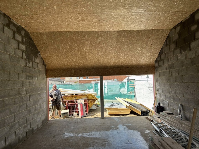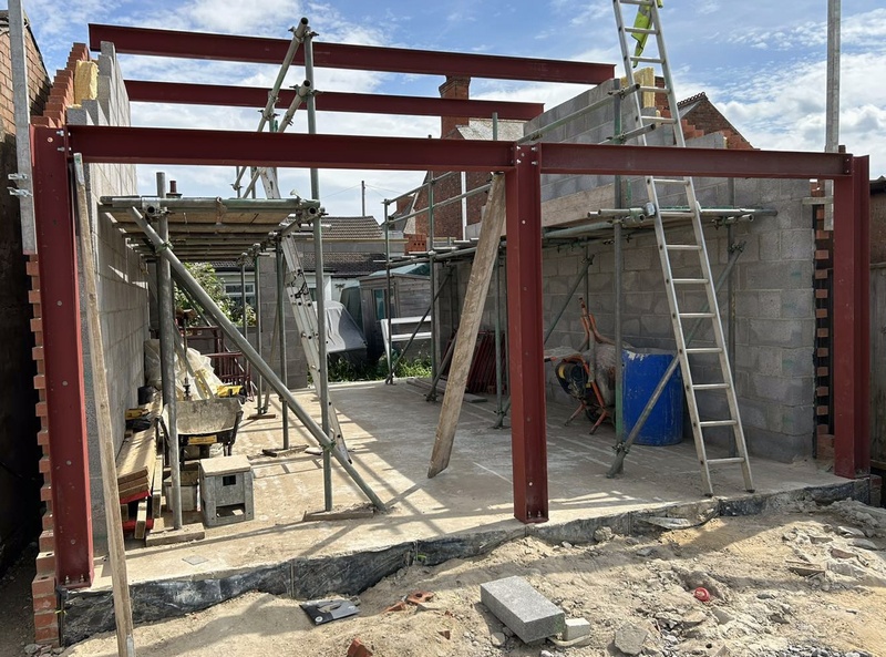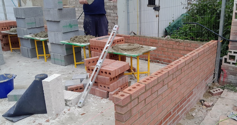 Then the brickwork started going up. We had bricks on the outer skin and thermal concrete blocks on the inner skin. The picture on the right below shows the steel lintels for the doors and window in the back wall.