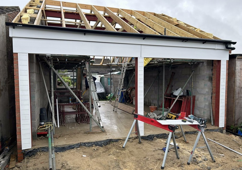 The main door frames are formed with a steel portal frame. The old wooden door frame would not have survived an accidental collision but this will. There are also a couple of steel purlins to take the load of the roof trusses. These can now be built in as the gables are built up to their full height.