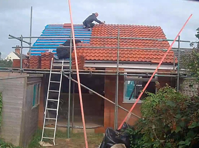 The next job was to get the scaffolding up and install the felting and the tile battens. The new tiles are all stacked ready for the roofer. The condition of the old tiles wasn’t good enough to reuse and we would have had difficulty in matching with reclaimed pantiles to make up to the larger roof area, so we got new.