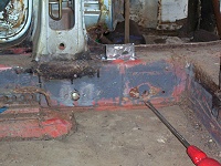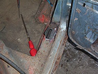 | A close up of the mounting points – the bare steel lip is to hold the locating cage in place within the cavity. The forward hole (to the right) is an existing panel locating hole which I have enlarged and the rear hole (to the left) is an existing hole. There is another panel locating hole just above and to the left of this. Mystified? All will become clear when the belt is installed on completion. |