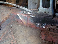 | Look carefully at the picture on the right here. You should be able to see a bolt hole in the two circles I have drawn. There is also a hole near the base of the B-post itself. After I had closed the sill I realised I had forgotten a point of detail which was going to give me a bit of a problem. As the door pillar for the Variant is in a different place from the Fastback, the lower seat belt mounting point is also in a different place. VW thoughtfully provided two holes, one for each position, but only provided a captive nut behind the one appropriate for the car. And I needed another nut on the other hole! Doh! |