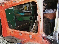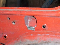 | I had a reinforcing plate with a nut welded on which I carefully manoeuvred through the window and held with a bolt through the forward hole. The screwdriver is pointing to the redundant hole. |