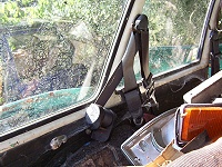 But for those who can’t wait, here it is installed in the back of the old Variant. The ring on the end of the middle piece of belt fits over the hook when the rear seat squab is upright. |