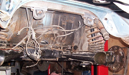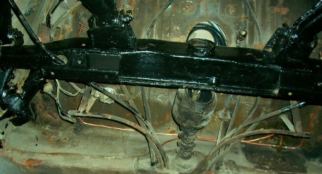 A view of the underside at the rear (without the engine and gearbox) and the shiny new copper pipes can be seen running across the car. The sub-frame has been cleaned and repainted.