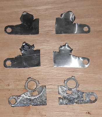 The set of pads I acquired didn’t include new piston retainers, the originals were rusted out so I made some new ones out of stainless steel sheet. This shows the new blanks after the rough-cut, ready for fitting into the callipers, with the sorry looking originals at the bottom.