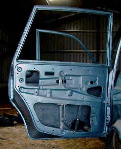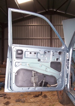 Here it is fitted to the door. As for the front doors, I have had to raise the bottom mounting point and make a bracket to hold it and trim the flange around the opening in the inner skin to clear the motor. The motor can be seen tucked tight into the bottom corner of the door frame.
