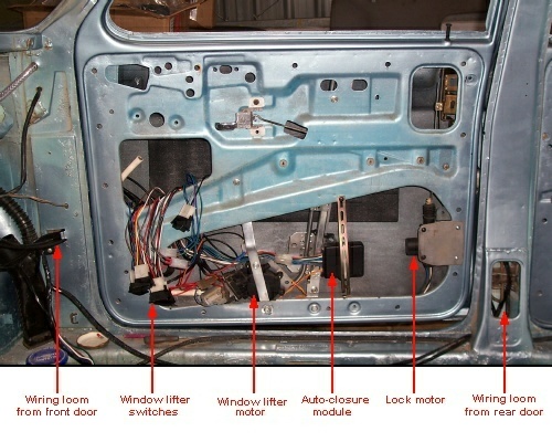This is a view of the driver’s door showing the switches wired in (and hanging loose) together with the auto-closure module.