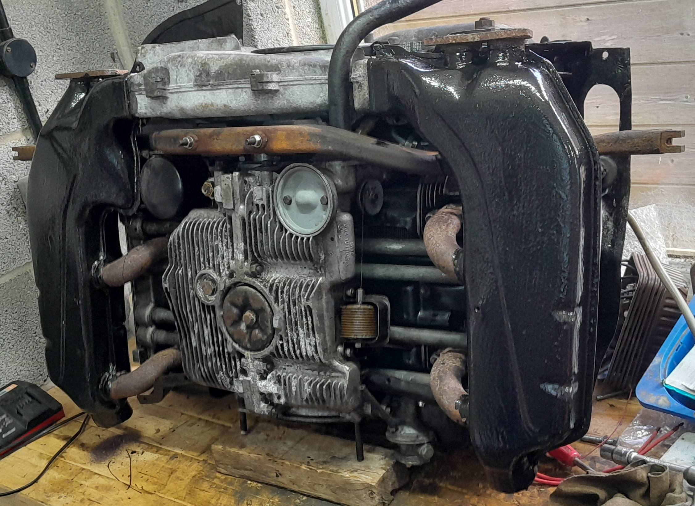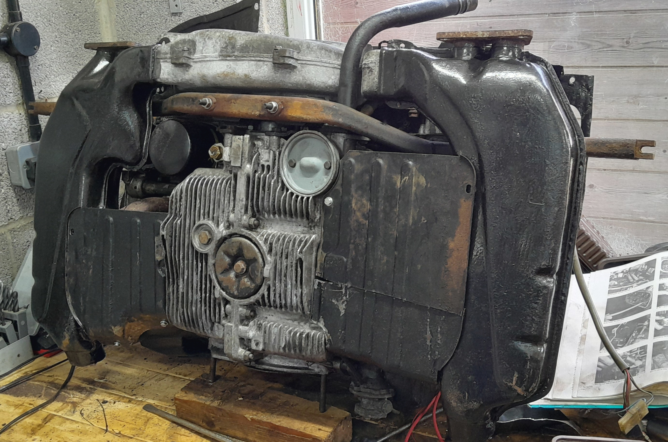The Type 4’s 1800 engine completely filled the hatchback I was using as a runaround at the time. It’s well packed with cardboard to ensure the boot carpeting wasn’t damaged. With a little bit of ingenuity I unloaded the engine and placed it the bench in my garage along with some spares, there are more on the floor out of sight. The lifting slings are still draped around the engine.