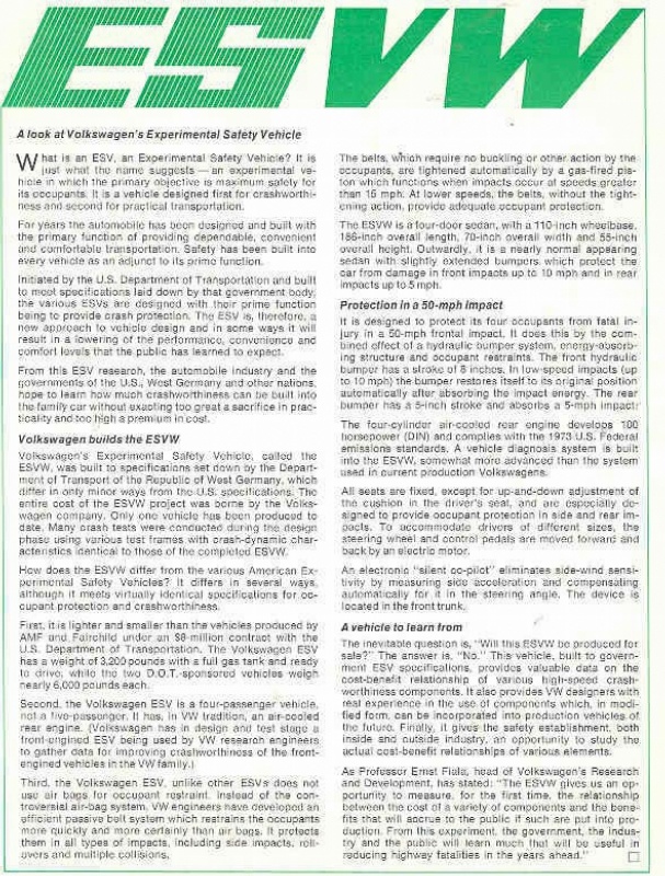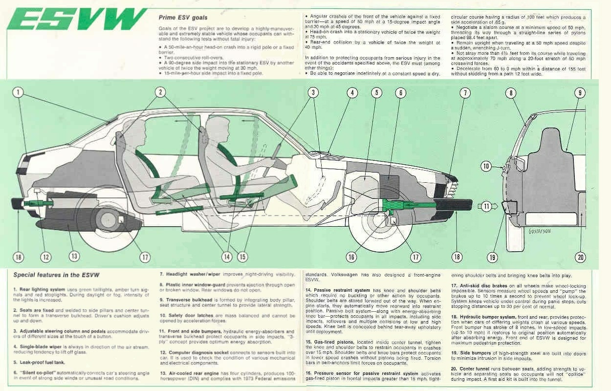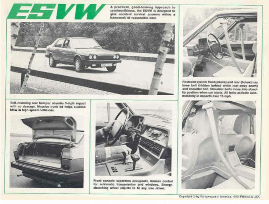 During the very early 1970s, Volkswagen developed an Experimental Safety Vehicle, a project initiated by the US Department of Transportation. The prototype car was developed to meet the requirements of the West German Department of Transport which were similar. The following pages were scanned from a brochure produced by VWoA in 1972. Click on the pages below for a larger sized image that you can read – but be warned – they are quite large!